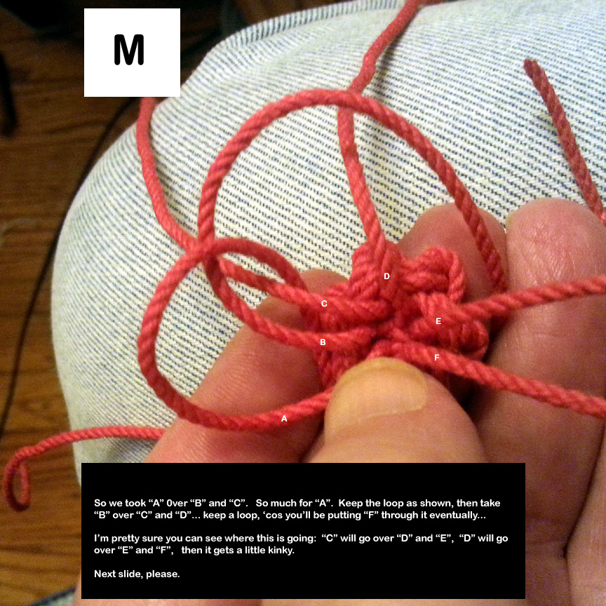 "J" shows the BACK of the knot with all six over the adjacent two and fed nicely up into the knot's body. (That ain't kinky... I'll show you kinky soon, and it won't involve motorcycles or handcuffs....)