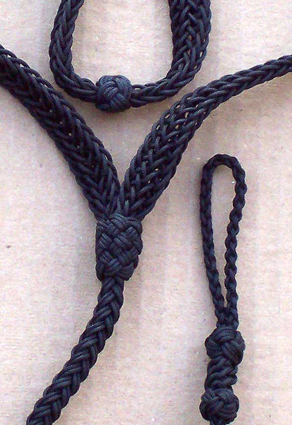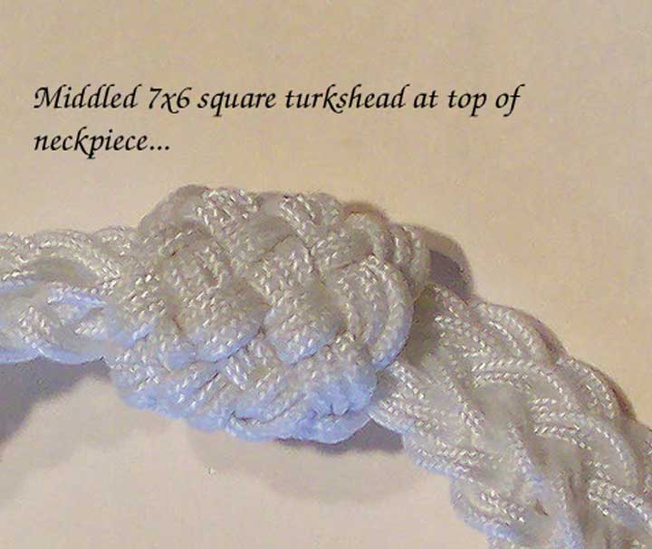 The braided neckpiece is middled by a 5x4 square turkshead and the two legs are mirror-image braided from that point to the breast