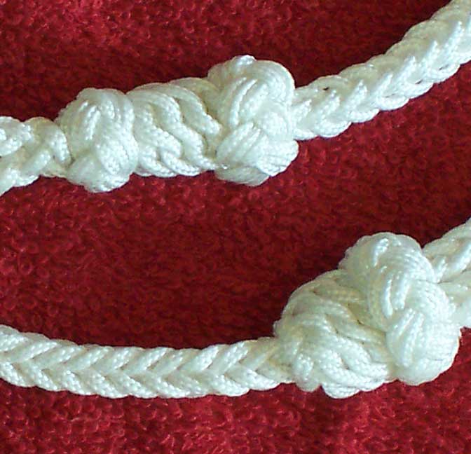 Footrope knots and fenderweave at the neck split, breastplate and the strop reductions, Applied footrope knots at the loop splice and as a decorative item at the midpoint on the 8-strand strop portion.