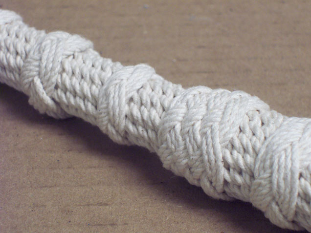 Bellrope of #15 cotton codline over a "laid" pudding (core). 20" - 22 " overall from top of eye to finial knot, and 2.75" diameter at the