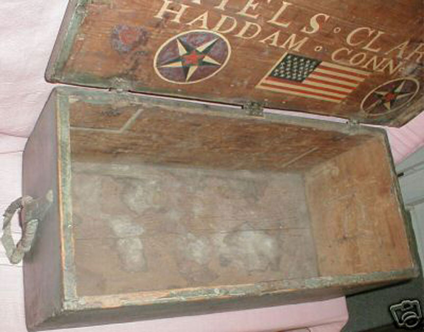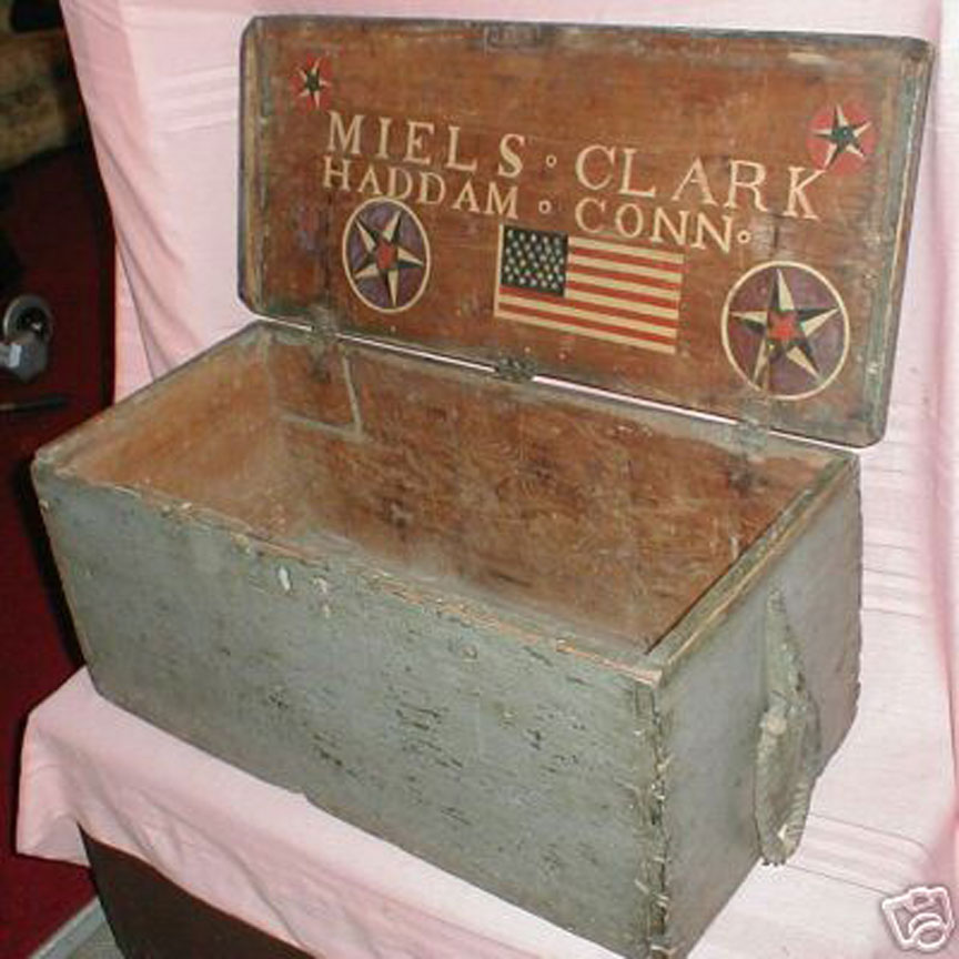 of Haddam, CT. Box appears to be of 1830's-40's construction or perhaps a bit earlier due to the large size of the boards used. The decoration and