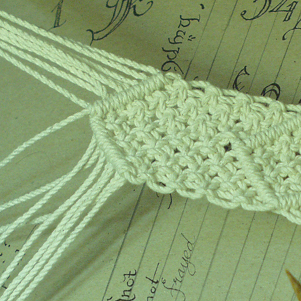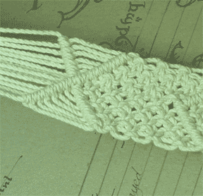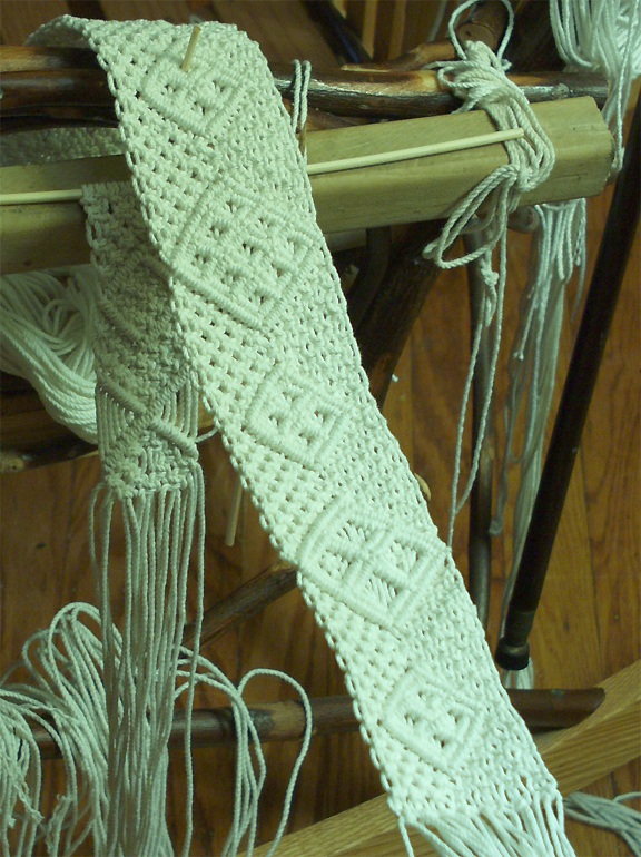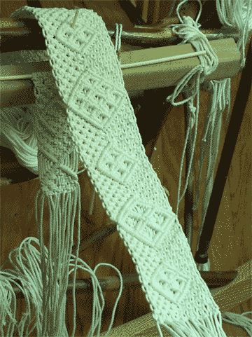 One VERY important item that was brought to my attention concerned finishing off the belt: Contrary to any other instructions in the tutorial, DO NOT trim off any splices, additions or drops until the belt is essentially done. Take the finished belt, dip in boiling water (98% water and 2% white vinegar) for a few minutes to "set" the knots, then hang in a not-too-sunny place and allow to air-dry completely before trimming off the ends and the "loosers" from the additions/ drops/ etc. This will give you a tighter-looking belt and will also (should the end-user throw it in a washing machine) give the knotting a much better chance of not pulling out. NEVER use fabric softener treatments when washing the belts!