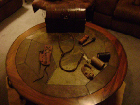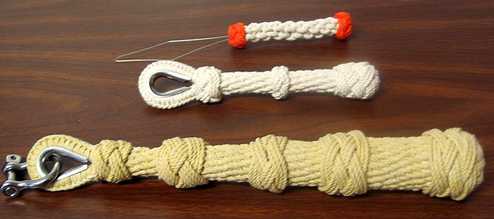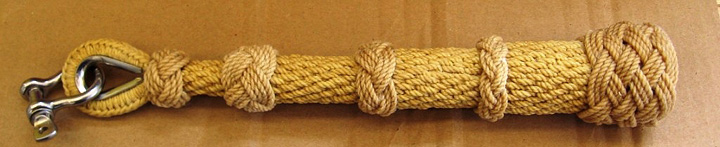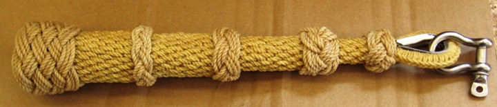 of a square-knot belt, a ringbolt or "Spanish" coxcomb capped by two three-strand turksheads, two more Boatswain's Call lanyards