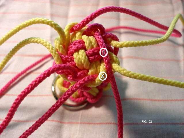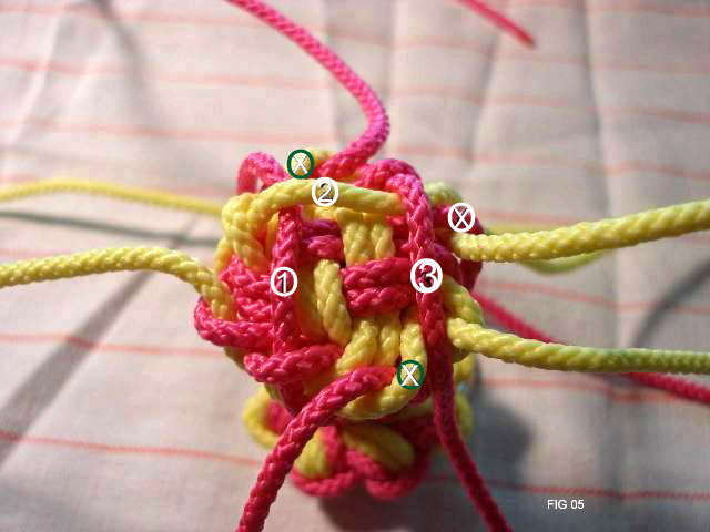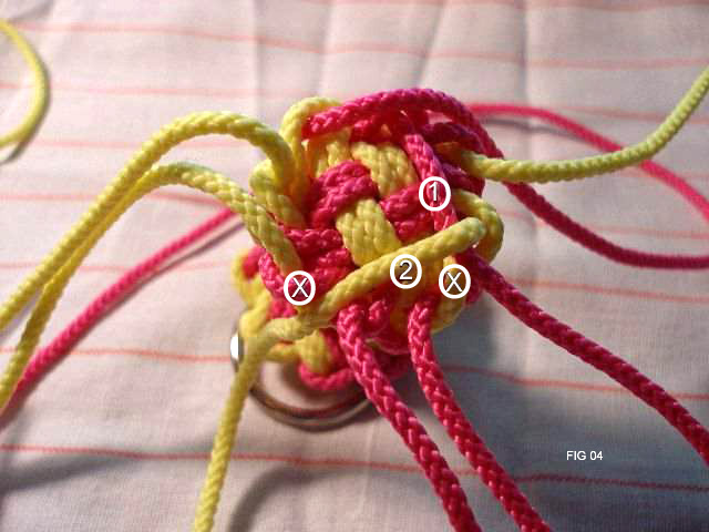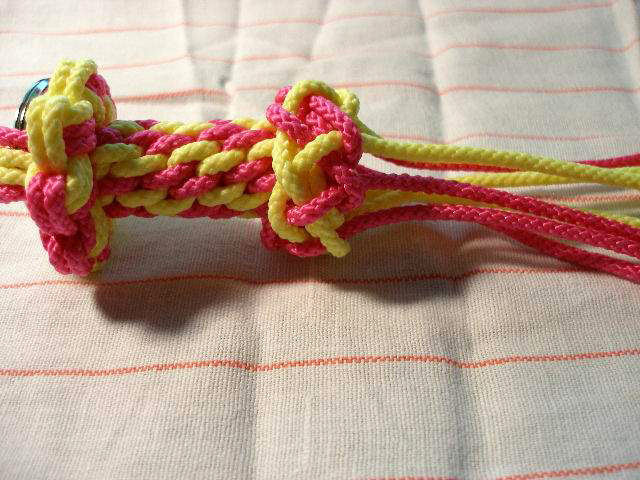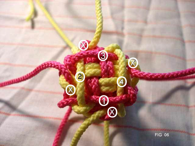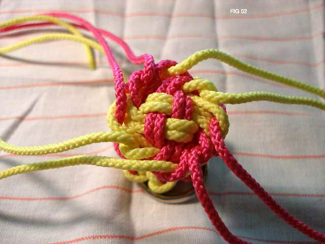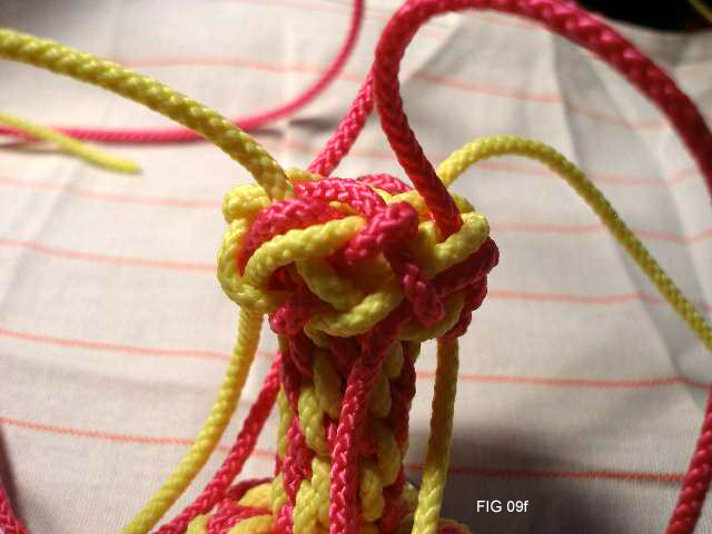 Make a 4 strand crown knot as shown in pics 3 thru 6. Be sure to lay