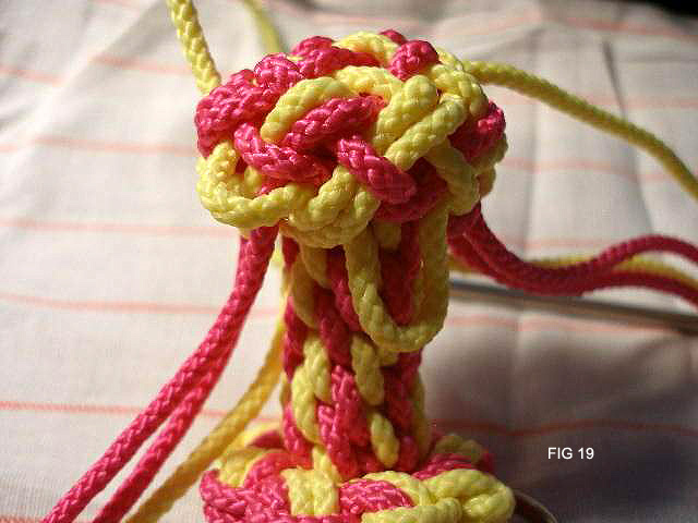 19: Continue with all 8 cords until they are all on top of the knot.