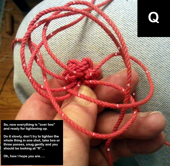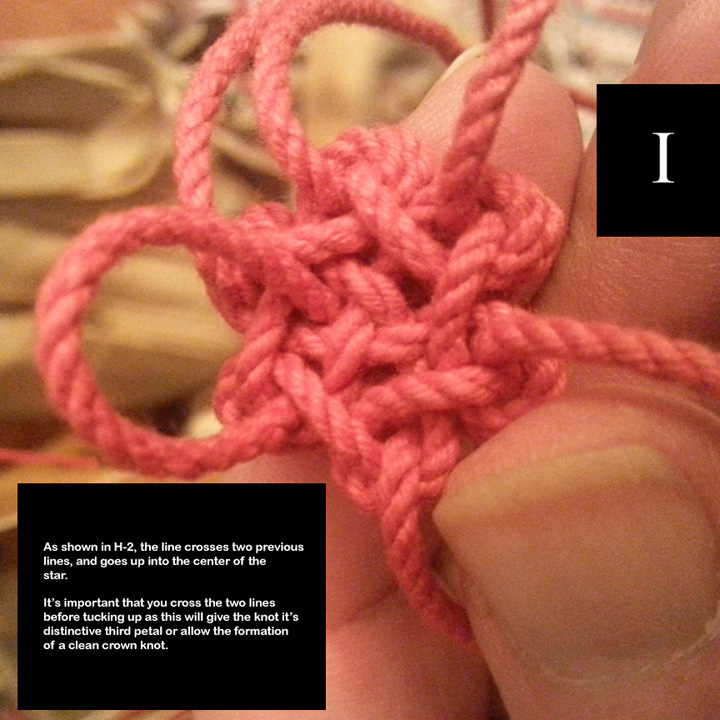 "J" shows the BACK of the knot with all six over the adjacent two and fed nicely up into the knot's body. (That ain't kinky... I'll show you kinky soon, and it won't involve motorcycles or handcuffs....)