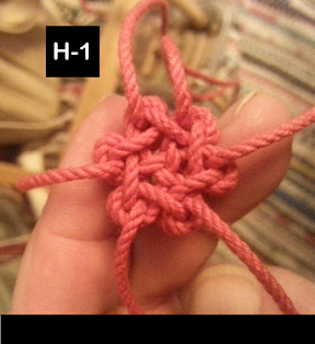 Take any line and lead it ACROSS two lines to the RIGHT and then stick it thru the body of the knot, with the end coming up and out in the center area of the face, between two lines and separated from the next line when it emerges. See the larger foto (click on H-1) for a more digestible explanation.