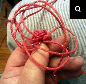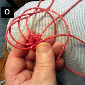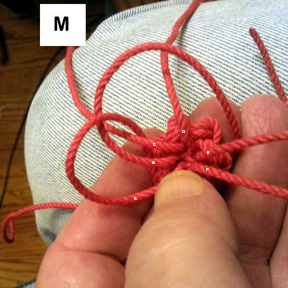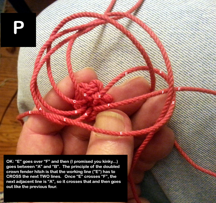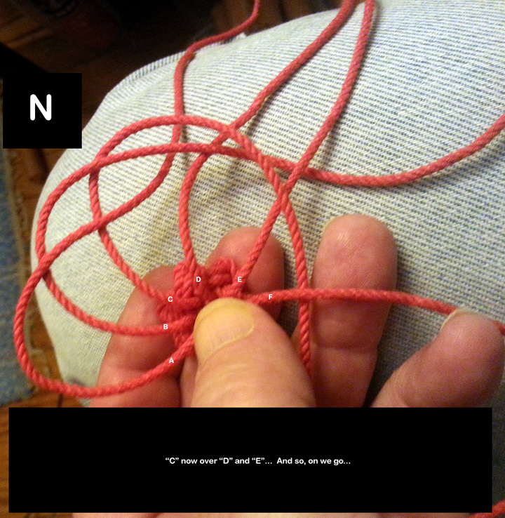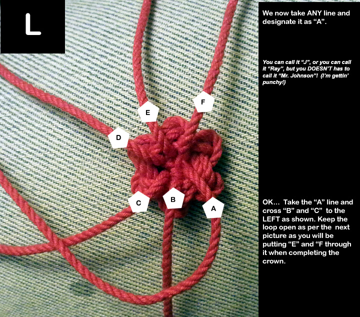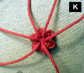 And "K" shows the FACE of the knot and how all six lines should come up and be separated out. Also note that the knot has NOT been tightened up other than from friction as we lead lines through their tucks...