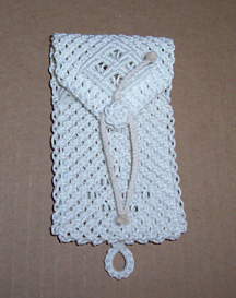 lanyard's eyes. Brass shackle attaches knife to lanyard. Pouch is of 9-knot (4.2" x 6.5" closed) square-knot