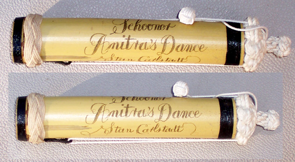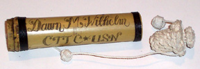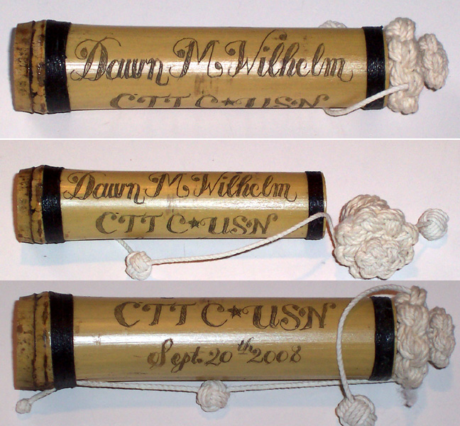 Scrimshawed into bamboo, your ship's name, your name and a homeport, or .... whatever.