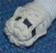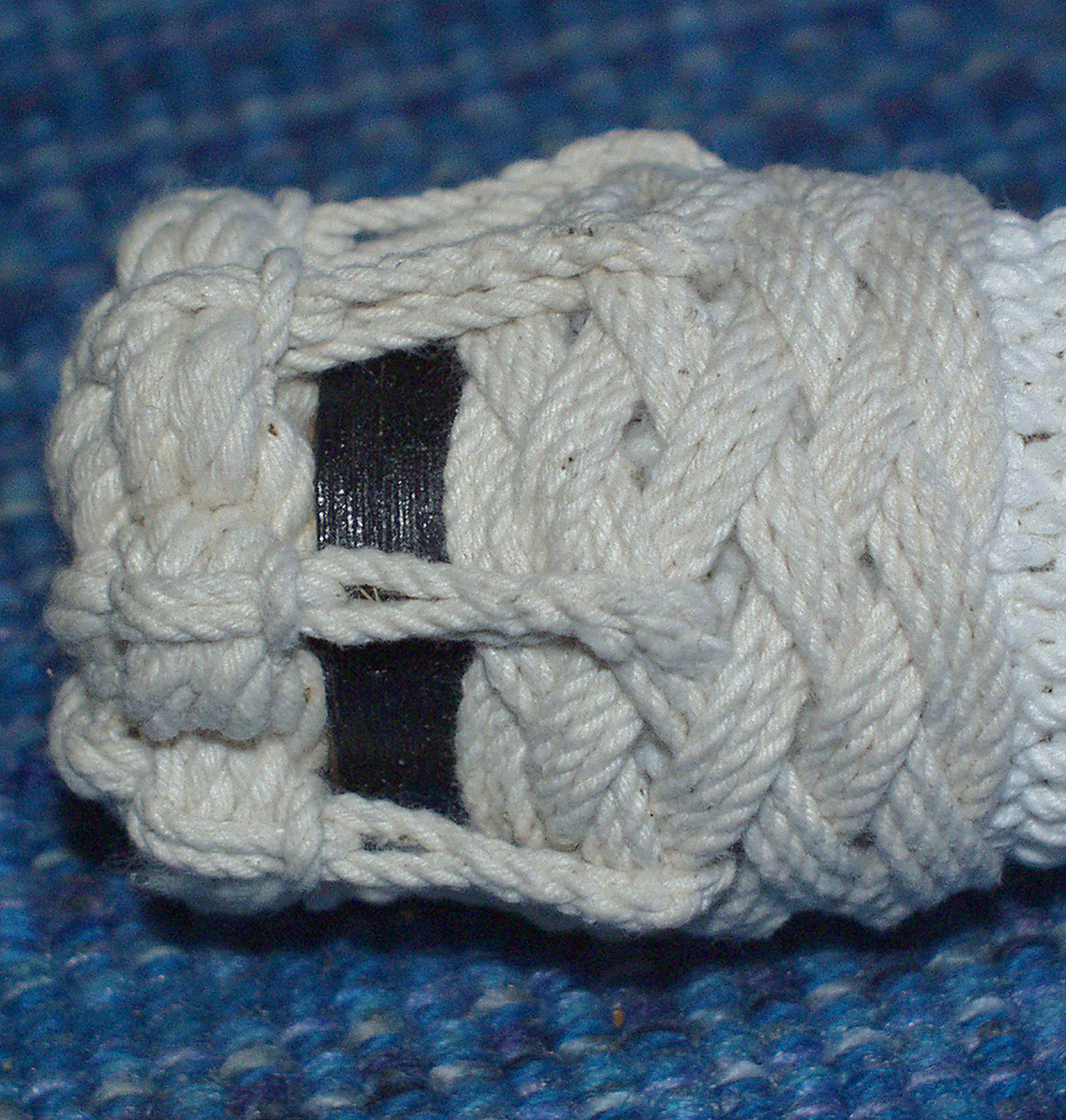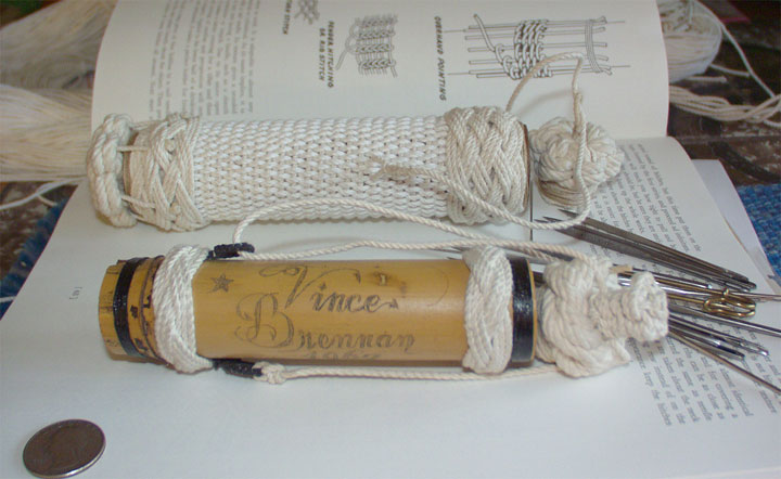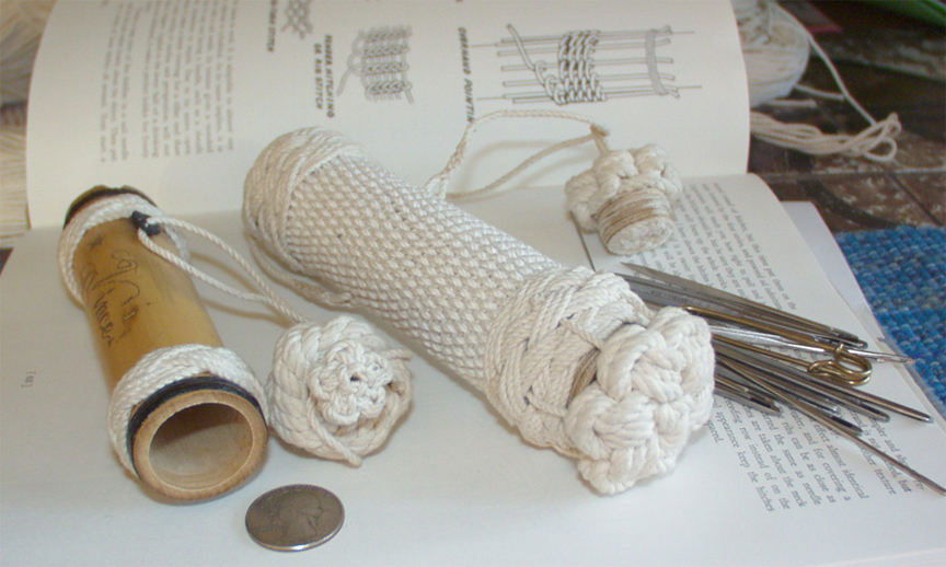 The case weave is of #15 cotton seine twine: 020606 has a fixed (glued-in) starknot stopper for a